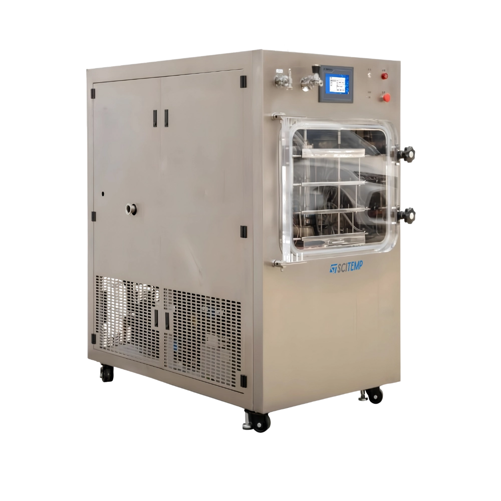 info@scitemp.comPilot Freeze Dryer SPFD-B17 comes with 200L capacity and a 2.25 ㎡drying area. With a 22L extraction rate, it ensures fast and efficient moisture removal. A standard PLC control ensures precise temperature and process regulation. Separating the condenser from the drying chamber enhances water capture efficiency and reduces drying time. The heating shelf enables freezing and drying in one place for seamless operation. Its stainless-steel chamber and trays offer durability, corrosion resistance, and easy cleaning.